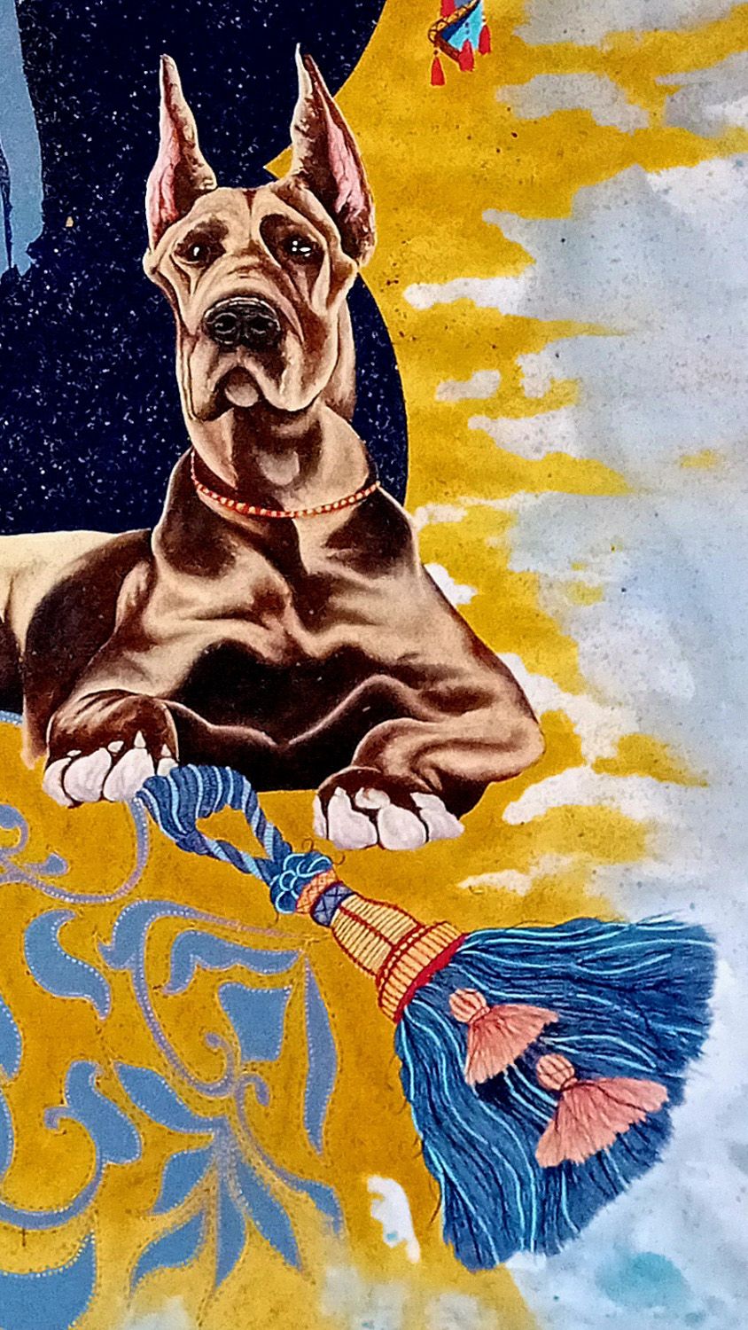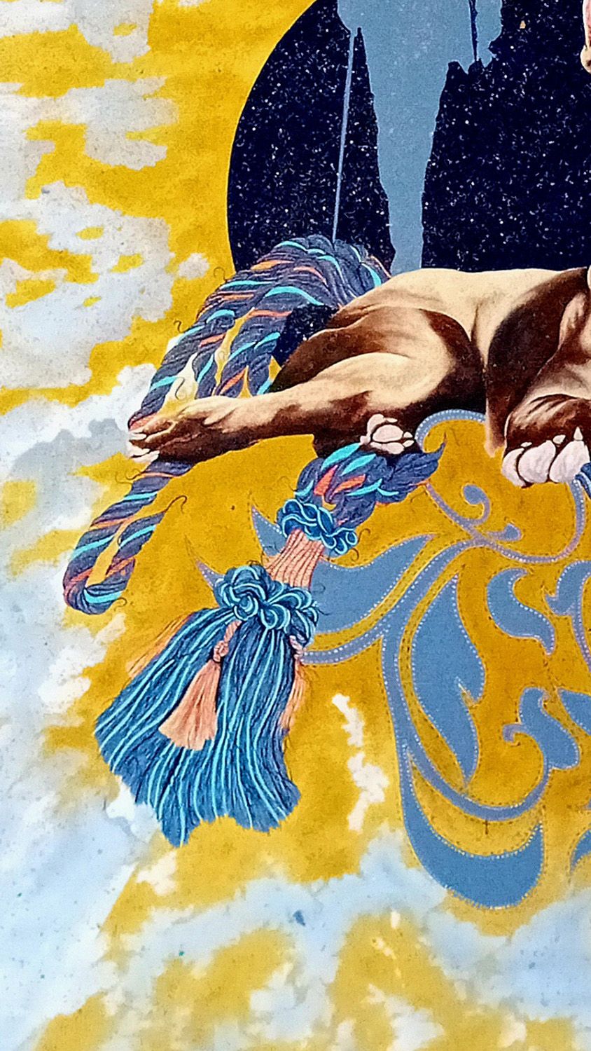 Immaginiamo un tappeto che riprende il motivo del maestoso tappeto che ricopre la scalinata all’interno di Palazzo Ducale dove troviamo elegantemente adagiato l’alano Bendicò, il quale ci accoglie come se fosse un cortese maggiordomo. Dietro di esso, prima di perderci ne consueto mare di nuvole, maestosi drappi celesti e dorati ci portano a ricordare i meravigliosi tendoni che incorniciano ogni finestra a palazzo.